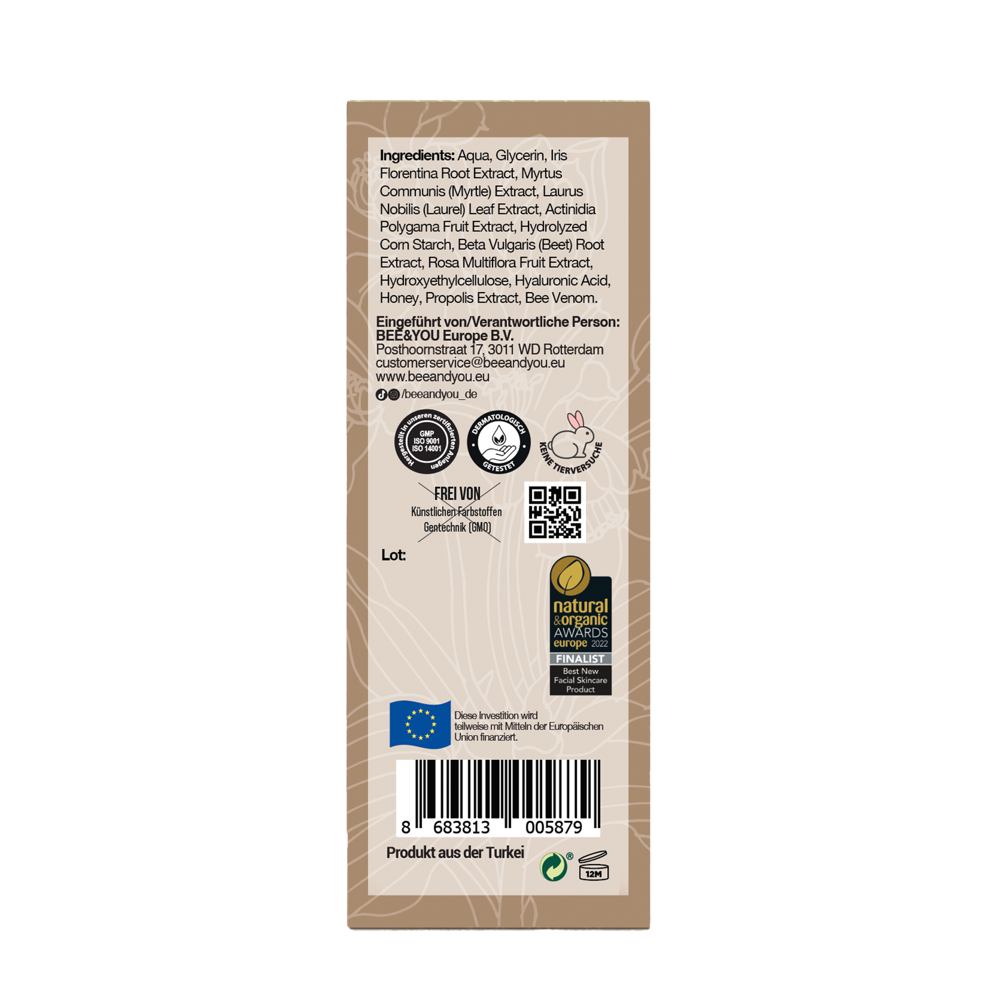 - Wirkstoffe: Aqua Gylcerin, Honig, Iris Florentina-Wurzel-Extrakt, Myrtus Communis (Myrte)-Extrakt, Laurus Nobilis (Lorbeer), Blattextrakt, Actinidia Polygama-Fruchtextrakt, hydrolisierte Maisstärke, Beta Vulgaris (Rüben)-Wurzelextrakt, Rosa Multiflora, Hyaluronsäure, Propolis-Extrakt, Bienengift