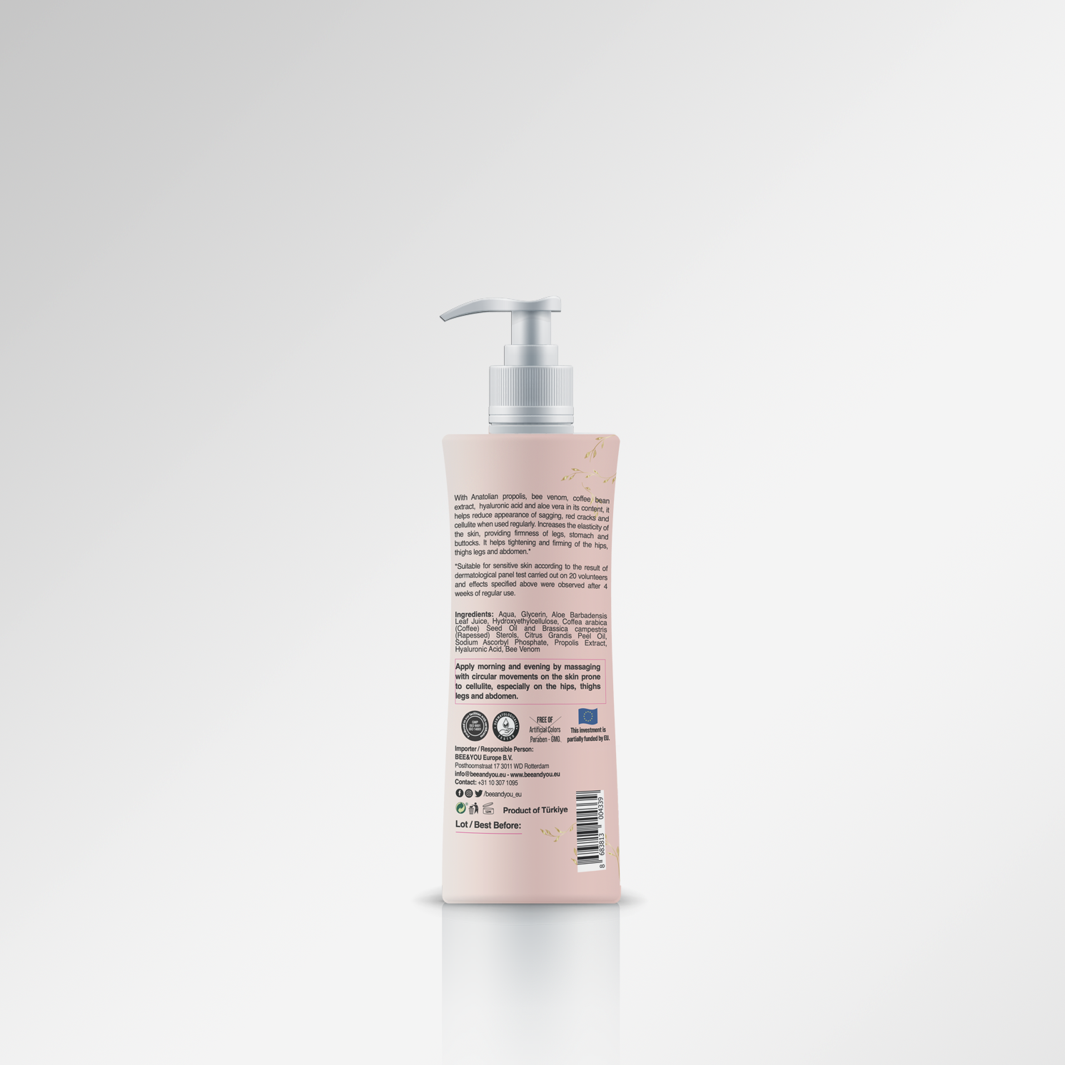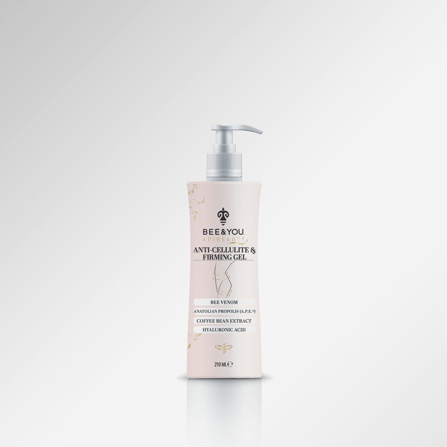 BEE&YOU SKINCARE Anti-Cellulite Gel, containing bee venom, Patented Pure Anatolian propolis, coffee seed oil, hyaluronic acid, and aloe vera, offers a natural and effective way to help reduce cellulite by firming the skin.