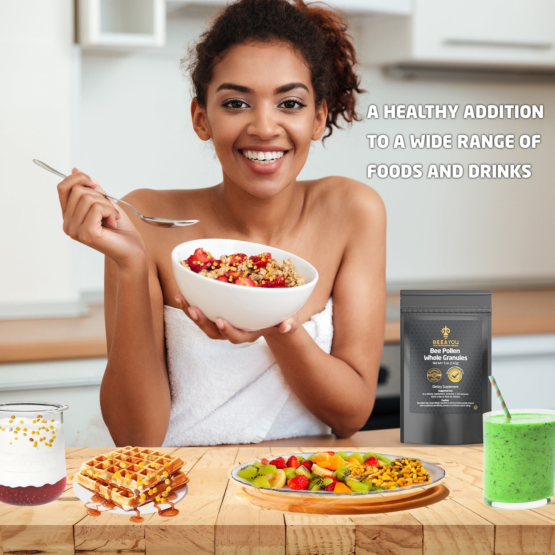 IMMUNUNTERSTÜTZENDES SUPERFOOD:* Bienenpollen wird nach Muttermilch und Ei oft als „das vollständigste Lebensmittel der Natur“ bezeichnet, dank seines reichen Nährstoffgehalts. Du kannst es mit deinen Lieblingsrezepten verzehren (z. B. in Müsli, Joghurt, Salat usw.).