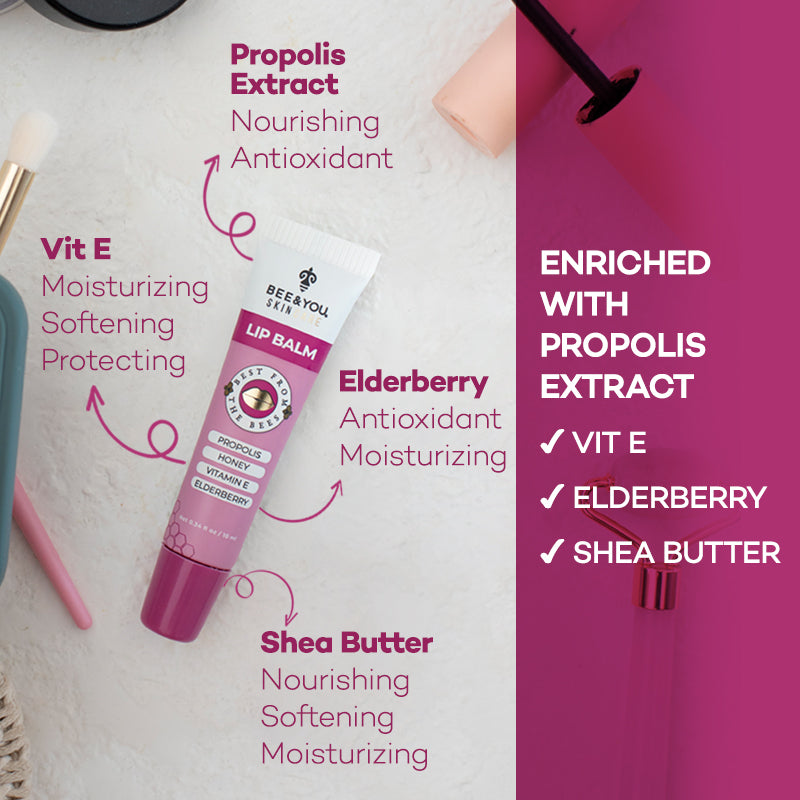 100% REINER NATÜRLICHER LIPPENBALSAM: Olivenöl, Bienenwachs, Soja-Glyceride, Sheabutter, Holunderbeeren-Extrakt, Aqua, Glycerin, Propolis-Extrakt, Honig, Vitamin E Acetat, Vitamin B5, Wald-Erdbeer-Extrakt.