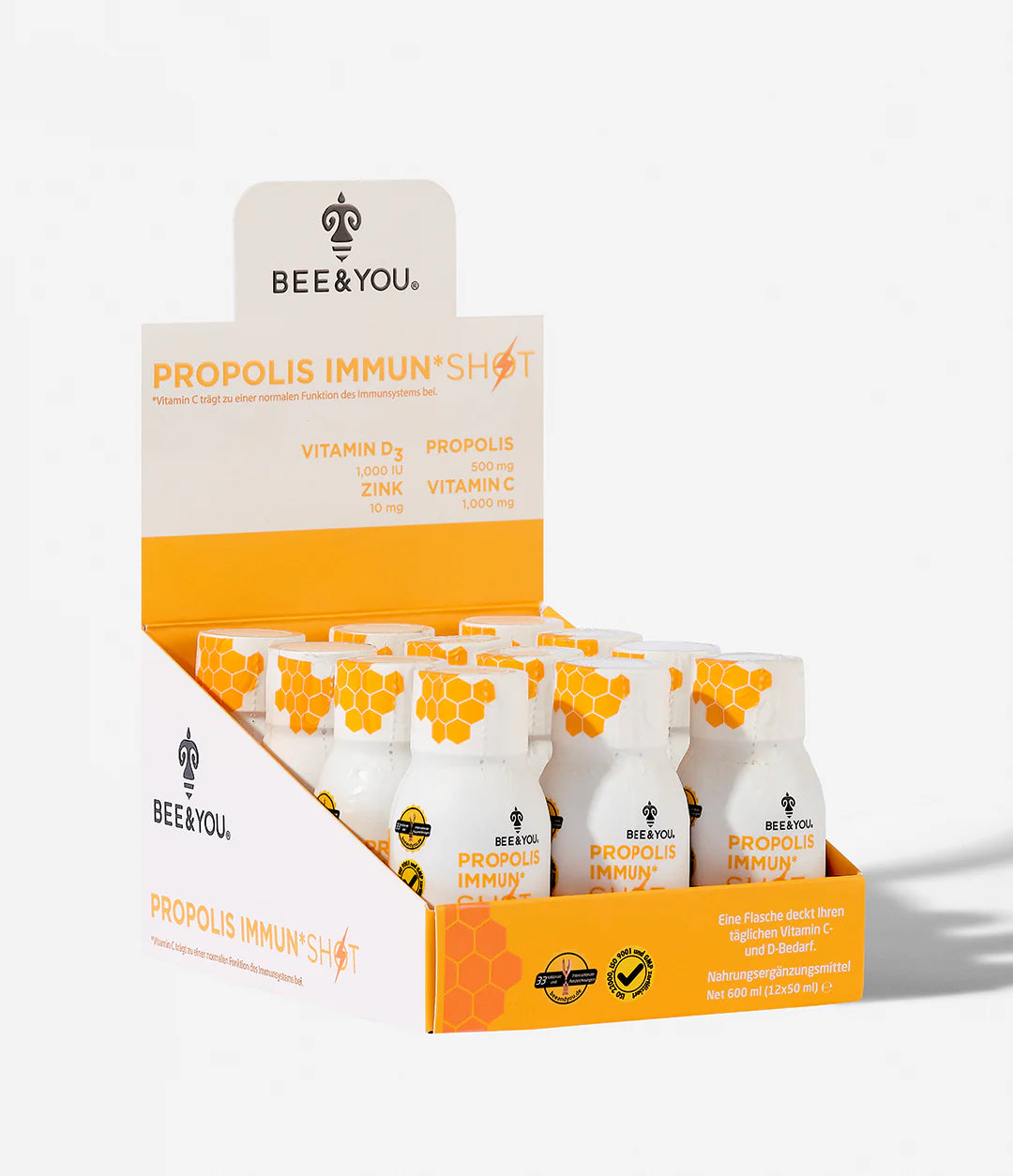Der Propolis Immun Shot kombiniert Propolis, Vitamin C, Vitamin D und Zink in einer erfrischenden Mischung aus Orangensaft mit Honig- eine köstliche Ergänzung. Ein einziger Vitamin Shot deckt den täglichen Bedarf eines gesunden Erwachsenen an diesen Nährstoffen. Der Propolis Immun Shot ist eine Unterstützung* für ein gesundes Immunsystem.