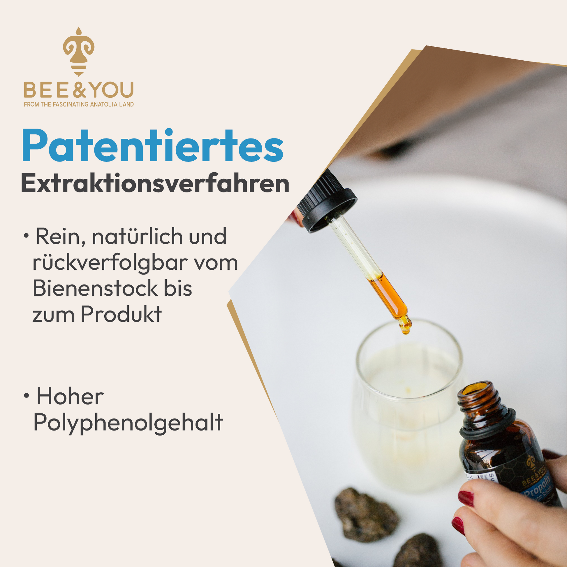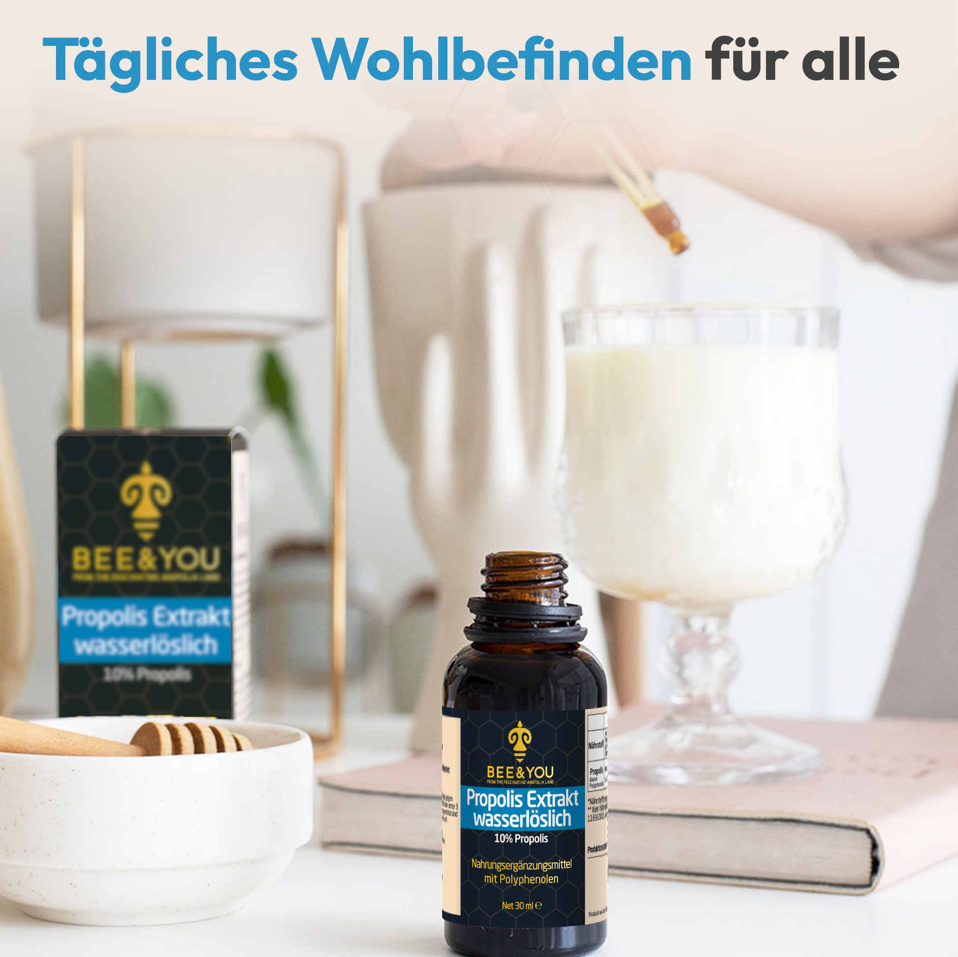 Propolis Extrakt ist eine konzentrierte Form von Propolis, die durch Extraktion gewonnen wird. Dieser Prozess entfernt bestimmte Bestandteile der Ausgangssubstanz und hinterlässt die gewünschten aktiven Inhaltsstoffe in höherer Konzentration. Die Propolis Tinktur ist angereichert mit wertvollen Antioxidantien. Die Anwendung des Propolis Extraktes ist vielseitig. Unter anderem als Nahrungsergänzungsmittel mit wertvollen Polyphenolen zum Einnehmen. Das BEE&YOU wasserlösliche Propolis Tropfen kann oral verdünnt in Wasser als Mundspülung zum Gurgeln verwendet werden. Außerdem kann die Propolis Tinktur auch als Hautpflege äußerlich angewendet werden.