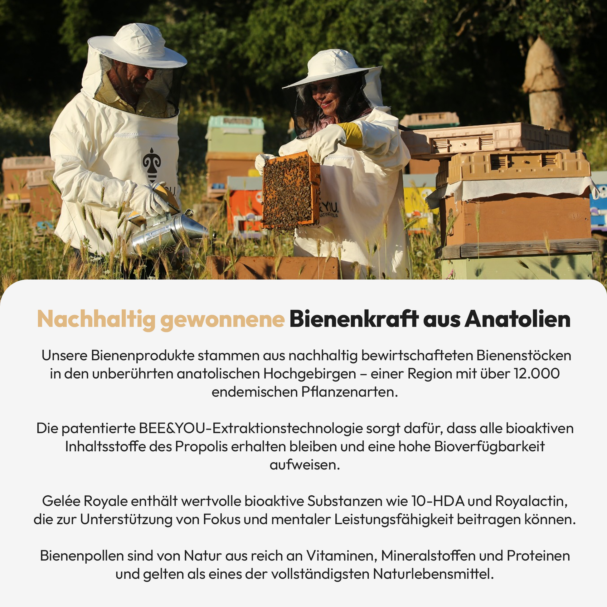 Zutaten: Gelée Royale, Bienengift, Anatolisches Propolis-Extrakt, Johannisbrot (mittelmeerländische Frucht)